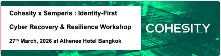 - เมื่อวันที่ 27 มีนาคม 2569 เวลา 8.30–12.00 น. ทาง Cohesity และ Semparis ได้ร่วมจัดทำ workshop ในหัวข้อ Identity-First Cyber Recovery & Resilience Workshop ณ The Athenee Hotel, Bangkok. ในงานมีผู้เชี่ยวชาญมาให้ความรู้มากมาย อาทิเช่น Mr.Naran Panthong, SE Manager, Cohesity Thailand, Mr.Benjamin LIM, CISSP – Regional Director ,Semparis และ Mr.Santhosh Justin – Senior Pre-Sales Solutions Architect ,Semparis