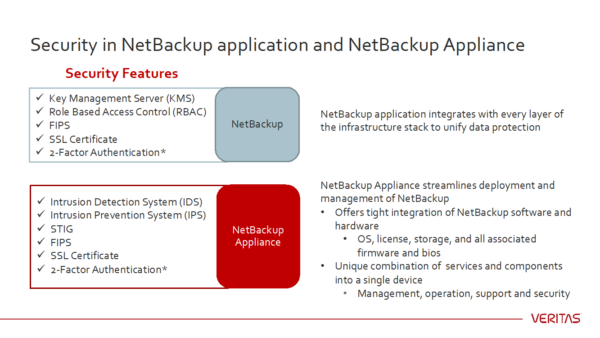 Veritas ให้คำแนะนำด้านความมั่นคงปลอดภัย (Security Guide) โดยอธิบายคุณลักษณะ (Features) ของระบบความมั่นคงปลอดภัยที่ทำงานอยู่ใน NetBackup Appliance 3.1 ได้แก่: